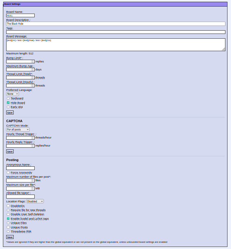 Moderation Manual: This is a document that explains how moderation works. E-mail: You can change the email on record if you ever lose access to your email or simply want to use a different address. Always use role signature: This is how you'll capcode, which is posting with a unique signature beside your name so that posters can verify the role of whoever posted. If you have enabled the Name field on your board, you (and any vols) can also accomplish this by adding #rs in the name field, either after a typed name or in an otherwise-blank field. This is the recommended way to capcode. Receive e-mail report notifications: This will automatically email the address saved above with every report that your board generates. Don't show board reports on the global list: This will turn off board reports in your report queue and only show global reports. However, global reports are only visible to global staff, so as a Board Owner this option should not be used. Password Change: The section should be self-explanatory. Delete Account: This will delete your User Account, but will not delete any boards you own; instead they will be listed as *Abandoned* in the Board List. Owned Boards: Any boards you own will be listed here, and clicking them will bring you to the Board Management page which is explained below. Volunteered Boards/Latest Postings: This is an extremely valuable tool for moderation purposes. Click Latest Postings and it will show you the latest postings, but only for boards you own or are a volunteer for. Using a tab-reloading addon for your browser of choice on this page is the most efficient method of monitoring your board(s). Create Board: Board URL is what your board's actual URL would be. In the example posted in this guide, the URL is "Kwyjibo", and so the board shows as "/kwyjibo/", and would be accessible via the link of "https://8chan.moe/kwyjibo/". This cannot be changed later. Board Name is your board's name. Board Description is a description of the board, which will show underneath your board's name on your board's index page, as well as at the top of every new thread. Both the board's name and description can be changed at any time.